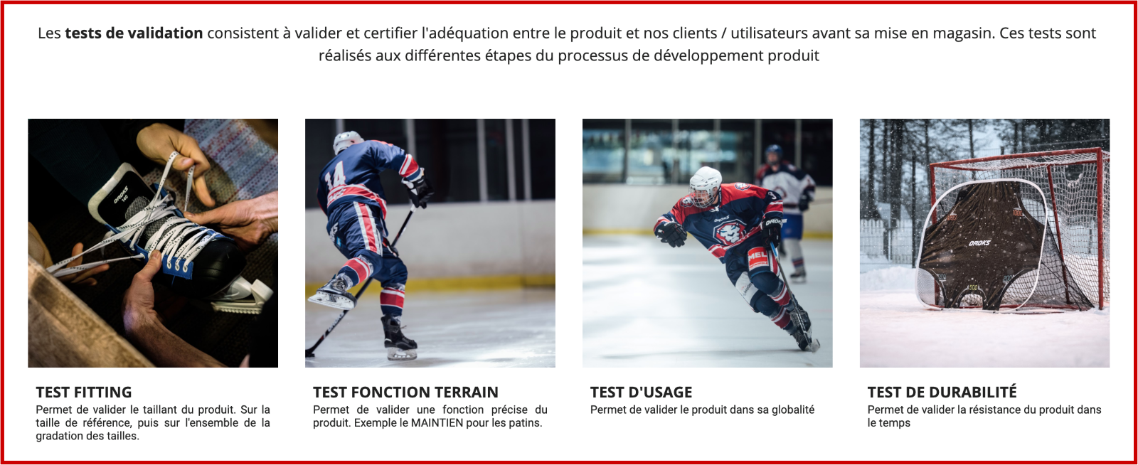 Câest ça, câĂ©tait lâidĂ©e. J’aime bien aussi faire du lien avec la R&D de DĂ©cathlon pour travailler ces mĂ©thodes de test et les adapter Ă nos contraintes du hockey sur glace. On travaille souvent ensemble dans ce qu’on appelle des « études ».